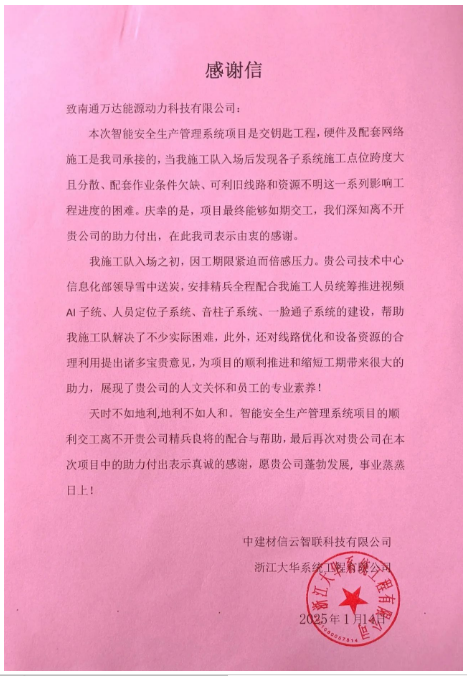 Recently, the Intelligent Safety Production Management System led by CNBM Group successfully passed the evaluation and acceptance and was officially put into operation. Nantong Wanda Power Co., LTD. has done a lot of effective work for the smooth on-line operation of the system, and received a letter of thanks from CNBM Xinyun Intelligent Union Technology Co., Ltd. and Zhejiang Dahua System Engineering Co.